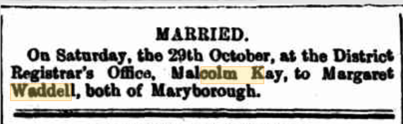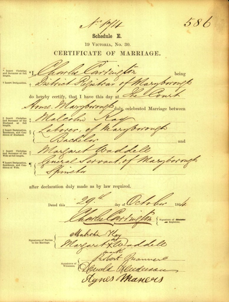 [3] Marriage Certificate, Malcolm Kay and Margaret Waddell, Maryborough Registry Office, 29 October 1864