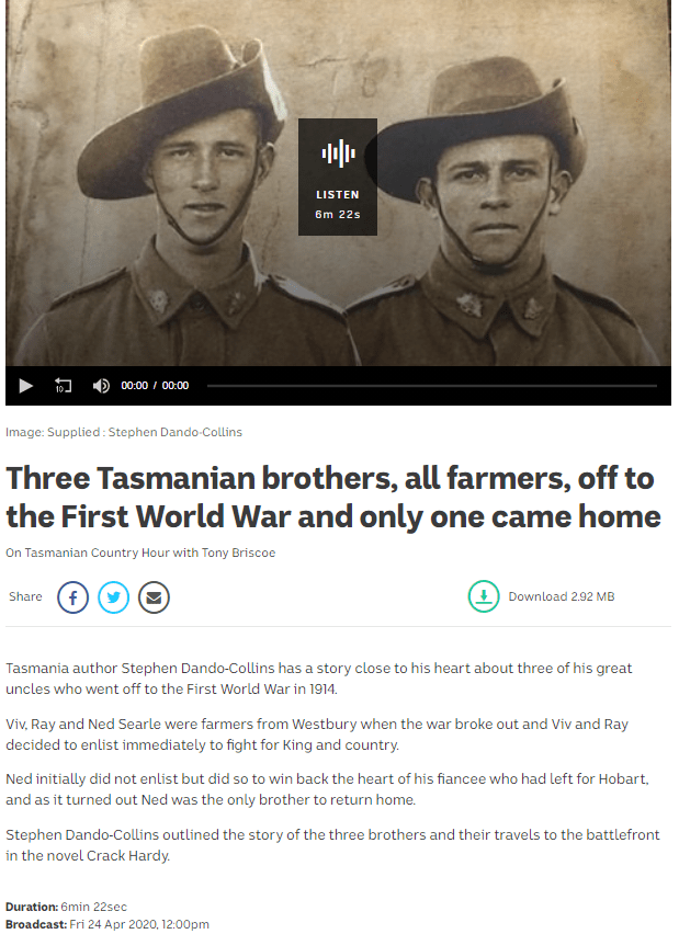 Oct 2020 update: Stephen Dando Collins was interviewed on ABC Tasmania on 24 April 2020 for ANZAC day about the Searle Brothers. https://www.abc.net.au/radio/programs/tas-country-hour/crack-hardy/12182240