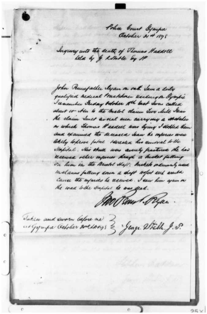 John Russetfather Ryan in oath. I am a duly qualified medical practitioner ?? in Gympie. I remember Friday October 18th last I was called about 10 ?? to the Bristol Claim Two Mile mine. The claim ??? I met several men carrying a stretcher on which Thomas Waddell was lying. I stopped them and examined the deceased knew?? the injuries would likely prove fatal ??? his removal to the Hospital. His skull was severely fractured he had received other injuries through a bucket falling on him in the Bristol Shaft. Buckets ????? used ????? falling down a shaft ???? ?? would cause the injuries he received. I saw him again on the road ?? Hospital he was dead.