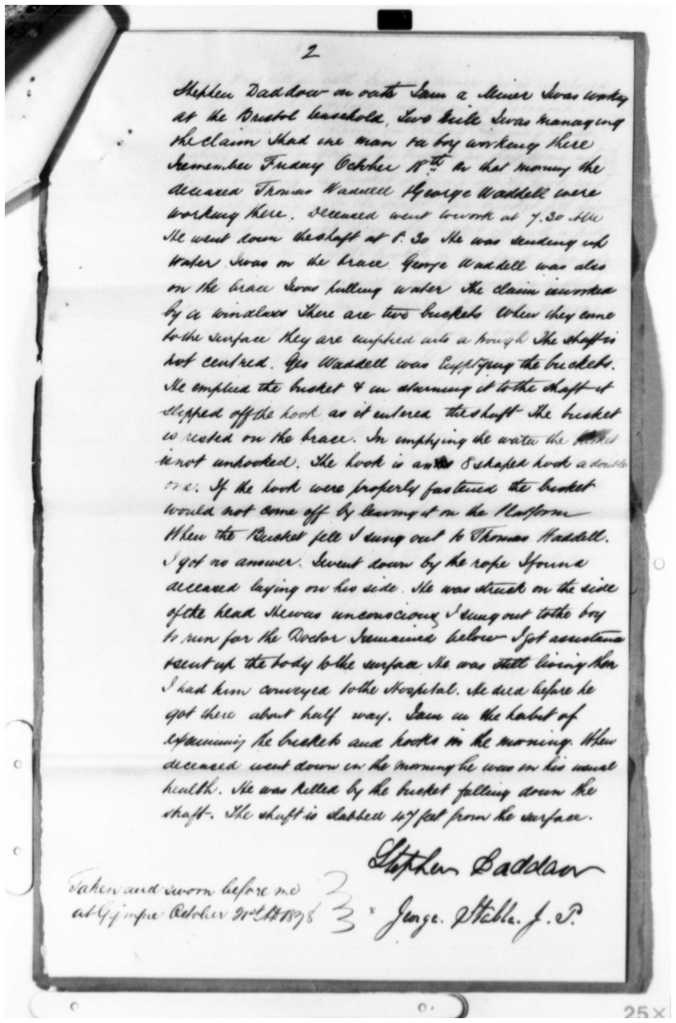Stephen Daddow on oath. I am a miner. I was working at the Bristol leasehold Two Mile. I was managing the claim. Had one man and boy working there ?? Friday October 18th. On that morning the deceased Thomas Waddell and George Waddell were working there. Deceased went to work at 730 ??/ He went down the shaft at 8:30/ He was descending? up water?. I was on the brace. George Waddell was also on the brace. I was pulling water the claim ?? by a windlass. There are two buckets. When they come to the surface they are emptied and a brough? The shaft is not centred. Geo Waddell was emptying the bucket. He emptied the bucket and on ??? it to the shaft it slipped off the hook as it entered the shaft. The bucket is rested on the brace. In emptying the water the bucket is not unhooked. The hook is an S shaped good a double one. If the hook were properly fastened the bucket would not come off by leaving it on the platform. When the bucket fell I sung out to Thomas Waddell. I got no answer. I went down by the rope. I found deceased laying on his side. He was struck on the side of the head. He was unconscious. I sung out to the boy to run for the Doctor. Remaining below I got assistance and sent up the body to the surface. He was still living then. I had him conveyed to the Hospital. He died before he got there about half way. I am in the habit of examining the buckets and hooks in the morning. When deceased went down in the morning he was in his usual health. He was killed by the bucket falling down the shaft. The shaft is dabbed? 47 feet from the surface.