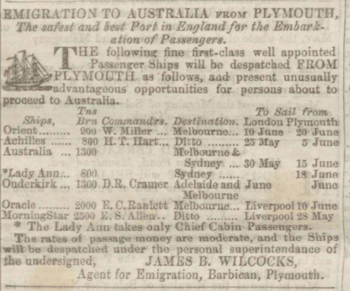 The ad says the Lady Ann will depart Plymouth on 18th June, and that it takes only Chief Cabin passengers. It also says the emigration agent is James B Wilcocks, and that he is located at Barbican, Plymouth.