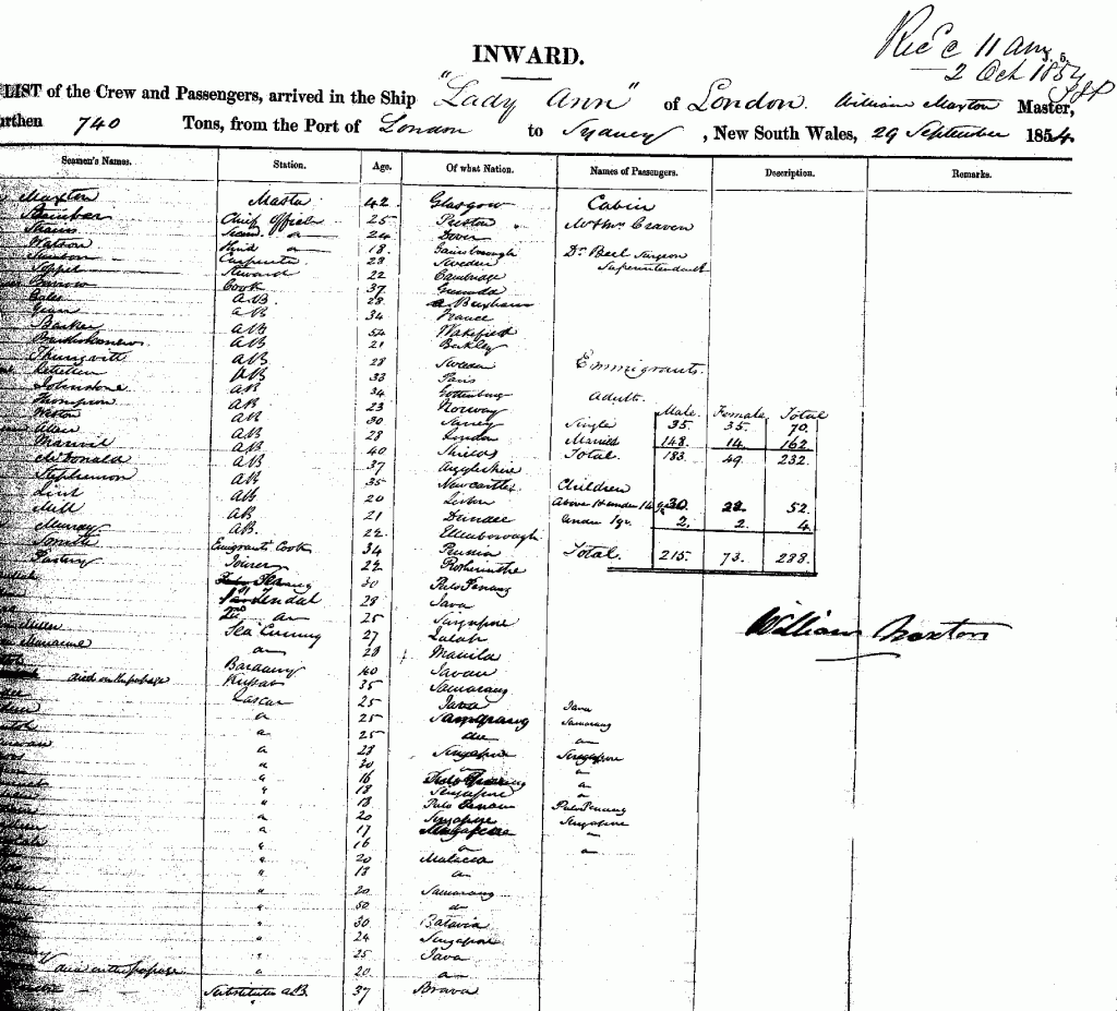 [5] Transcription of Crew and Passengers of Lady Ann June 1854 http://marinersandships.com.au/1854/09/082lad.htm