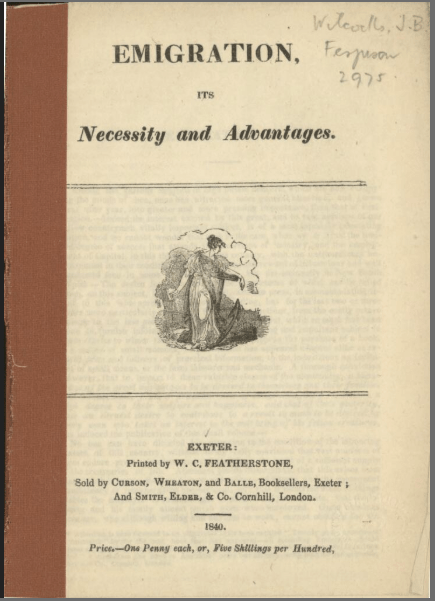 [3]Wilcocks, James B (1840). Emigration, its necessity and advantages. W.C. Featherstone, Exeter https://trove.nla.gov.au/work/22025445/version/51082211 and full text available at https://nla.gov.au/nla.obj-52764429/view?partId=nla.obj-87343850