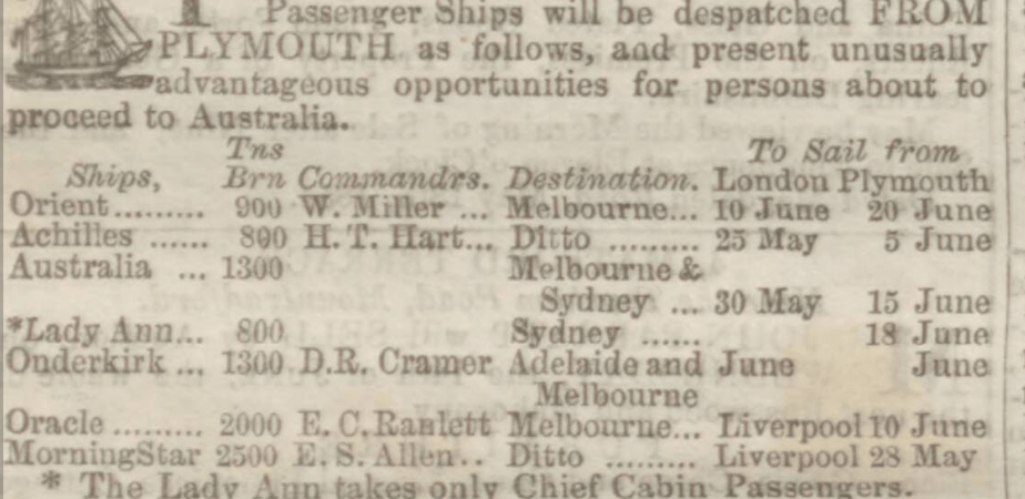 The ad says the Lady Ann will depart Plymouth on 18th June, and that it takes only Chief Cabin passengers. It also says the emigration agent is James B Wilcocks, and that he is located at Barbican, Plymouth.