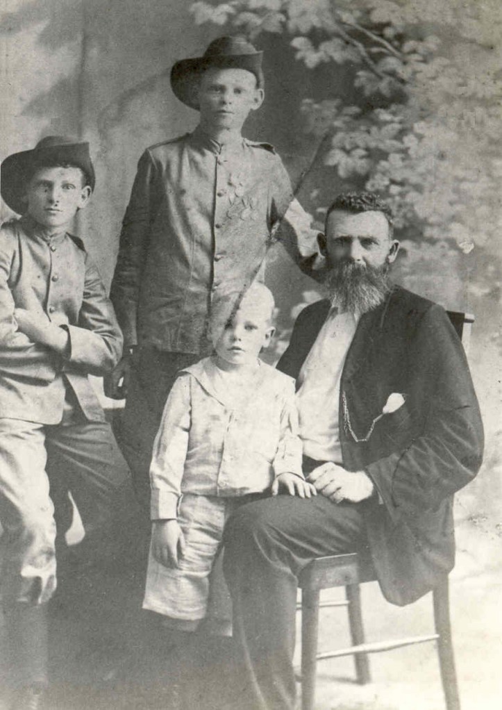 One of the most famous stories in the Waddell family is about George Malcolm Waddell b1894, and his brother Maurice John (Jack) Waddell b1896. Both were born in Charters Towers whilst their father George Waddell was working at the BlackJack gold mine [1] but later moved to Two Mile, near Gympie where their father George Waddell ran the Two Mile Hotel. Both were in the cadets from an early age and were pictured in their cadet uniforms and medals, with their dad George “Ginger” Waddell and their youngest brother Jim Waddell on his Dad’s knee. Given age of Jim Waddell (~4?) this photo must be from about 1908.