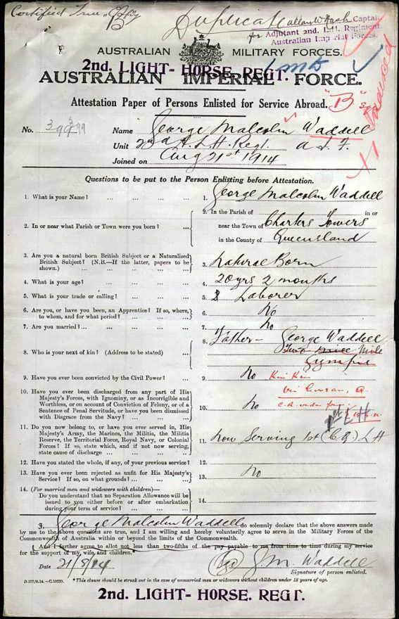 George Malcolm Waddell enlisted on 21st Aug 1914 when he was 20 [2]. He was 5 foot 11 with grey eyes and fair hair. His slightly younger brother Jack enlisted almost a year later, on 3rd Sept 1915, when he was 19 years old [3]. He had blue eyes and amber (red?) hair. His daughter Lennie Wallace (nee Waddell) has published a photo of Jack at enlistment, wearing fancy boots [1]. They were both part of the 2nd Lighthorse Regiment, and would have brought their own horses from home to the war with them. Family legend says George had a white horse [4] although so far I dont think anyone has spotted a white horse in any 2nd Lighthorse photos, despite everyone looking.