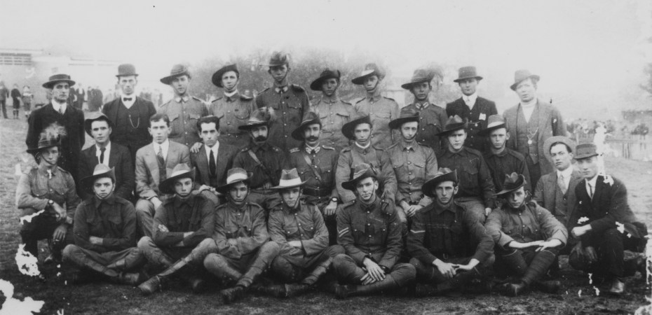 New recruits and officer outside the Drill Hall, Duke Street, Gympie, 1914. Source: State Library Queensland. Out of copyright. http://onesearch.slq.qld.gov.au/permalink/f/1c7c5vg/slq_alma21220036960002061