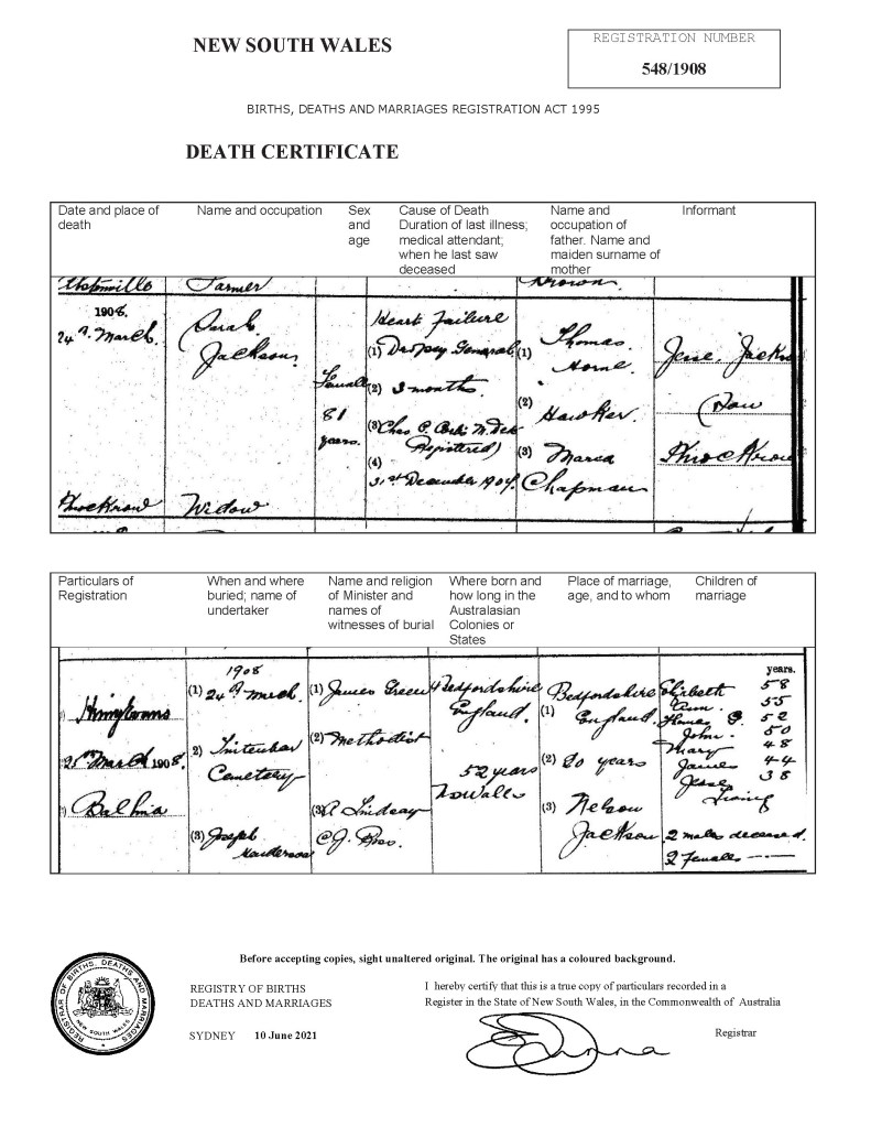 Nelson Jackson died on 25 July 1902, and Sarah Jackson nee Horne died on 9 March 1908. According to their death certificates, they both died at Knockrow NSW, which is in nothern NSW near Ballina, where many of their children lived, and were buried at Tintenbar Cemetery, NSW. There is no gravestone.