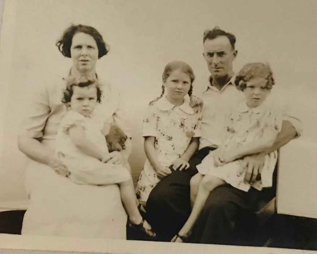 Stella’s attestation form dated Aug 1943 says she enlisted as a Private in Maryborough Qld where she was living and working as a waitress at the time [3]. The full record doesn’t clearly identify where she was sent, but my father told me she was sent to Atherton area in North Queensland. My Aunt R says that Stella often visited them in Malanda & she was really the only Hapgood aunt they knew well. When she came, she often sewed , and my Aunt R learnt to sew by watching Stella. The photo below is of Amy Patricia (Pat) Hapgood (nee Waddell) and Jeff Hapgood with their 3 eldest daughters R, M & J all dressed in Mickey mouse fabric dresses which were sewn by Stella.