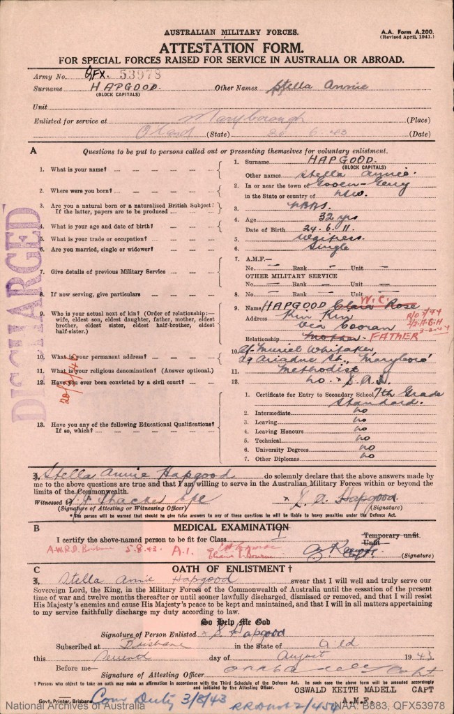 [3] HAPGOOD STELLA ANNIE : Service Number – QFX53978 National Archives Australia ttps://recordsearch.naa.gov.au/SearchNRetrieve/Interface/ViewImage.aspx?B=4480961