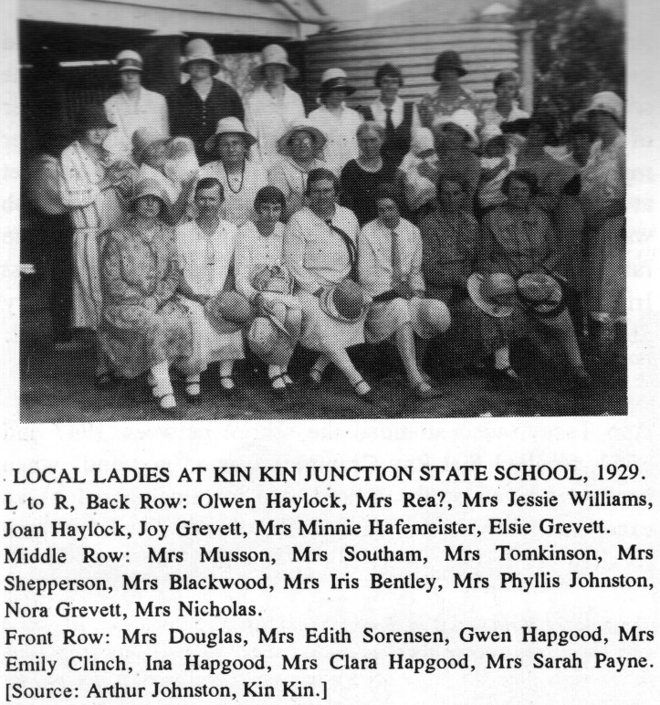 Front Row: Drs Douglas, Mrs Edith Sorenson, Gwen Hapgood, Mrs Emily Clinch, Ina Hapgood, Mrs Clara Hapgood, Mrs Sarah Payne. Photo originally from Arthur Johnston, Kin Kin.