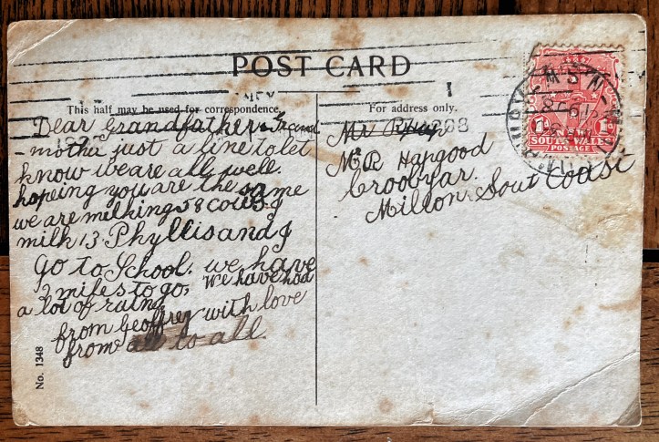 In a pile of Hapgood family history papers, I found a bright blue envelope. My mother had written on the front “VIP” which was saying something given there were some original photos in the same pile. Inside was a postcard which my grandfather Jeffrey Hapgood sent in 1908 when he was a boy of 8 or 9 years old. The postcard was sent to his grandfather in Croobyar, Milton Ulladulla. Jeff’s father William Hapgood had moved the family up to the Northern Rivers area, and this postcard was to send basic news back home to Jeff’s grandparents, Richard Hapgood and Jane Hapgood (nee Morris/Wearing).