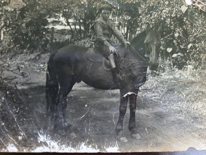 We also have this photo of Jeff Hapgood, about the same age as when he sent his postcard, in Northern Rivers. This photo was sent to me by my Aunt R* and my cousin S*. He is wearing a collared shirt with what we would now call a “sailor collar”, shorts, and boots whilst riding a pony. He looks pretty comfortable! He is believed to be about 8 years old in this photo.